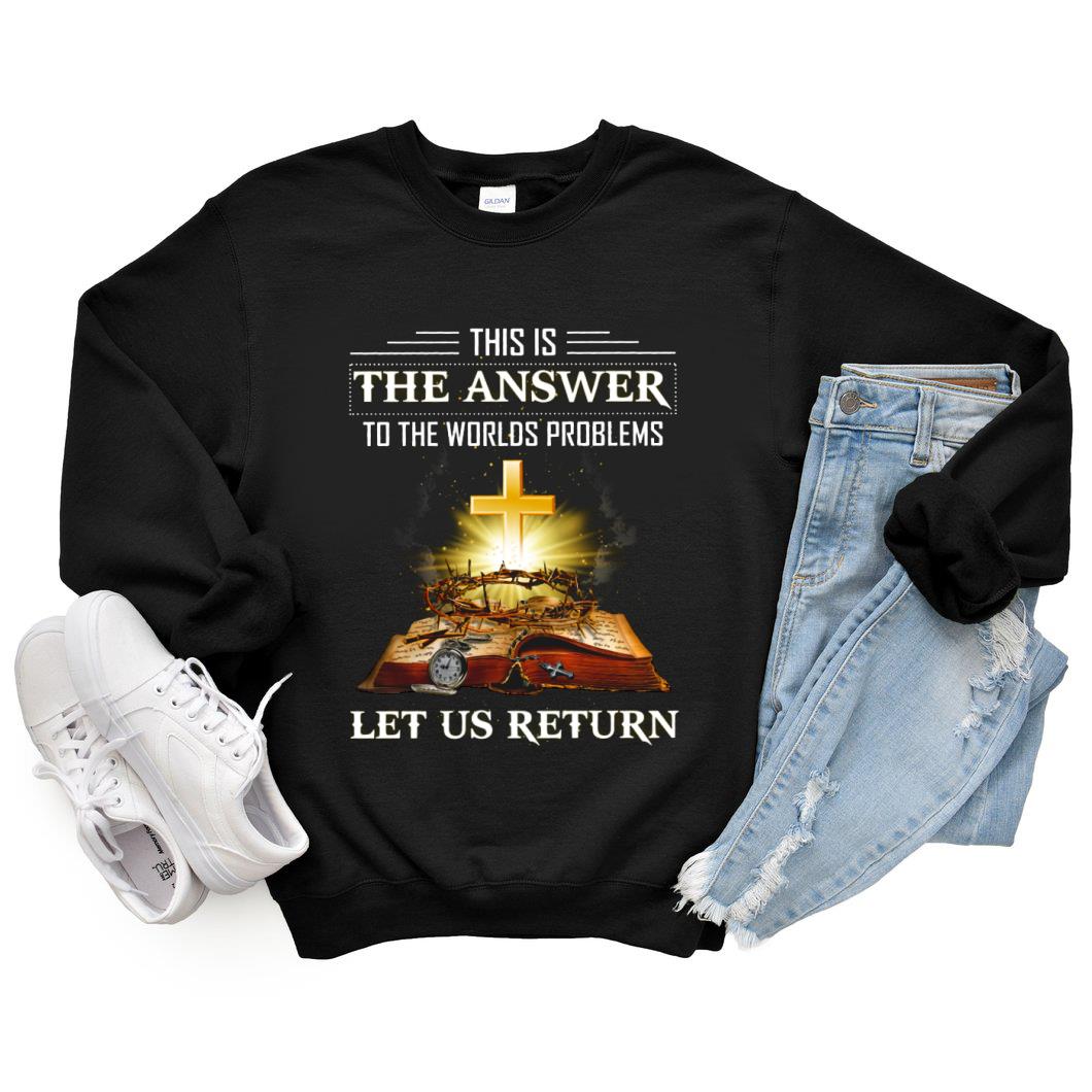 Original This Is The Answer To The Worlds Problems Let Us Return Shirt, The Cross Crucifix Book Shirt, Hoodie, Sweater, Longsleeve T-Shirt For Men and Women